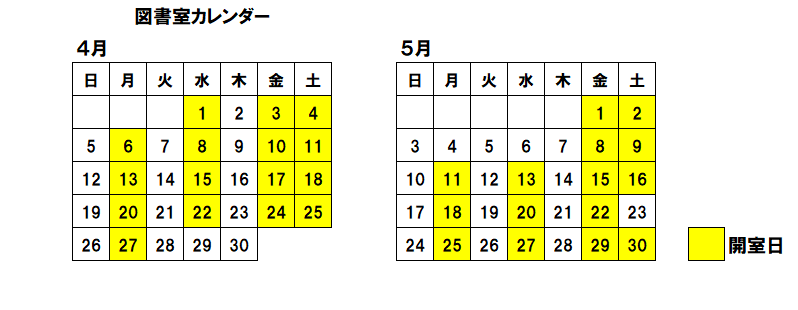 安堵町図書室は、毎週 月・水・金・土の曜日(時間:午前10時から午後5時)で、下記カレンダーのとおり開室しています。