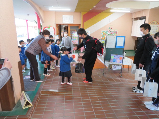 本日12月2日(水曜日)、こども園の方面に帰る生徒が3年生を代表してさつま芋を届けてくれました。園児たちの笑顔を見ることができて良かったですね。