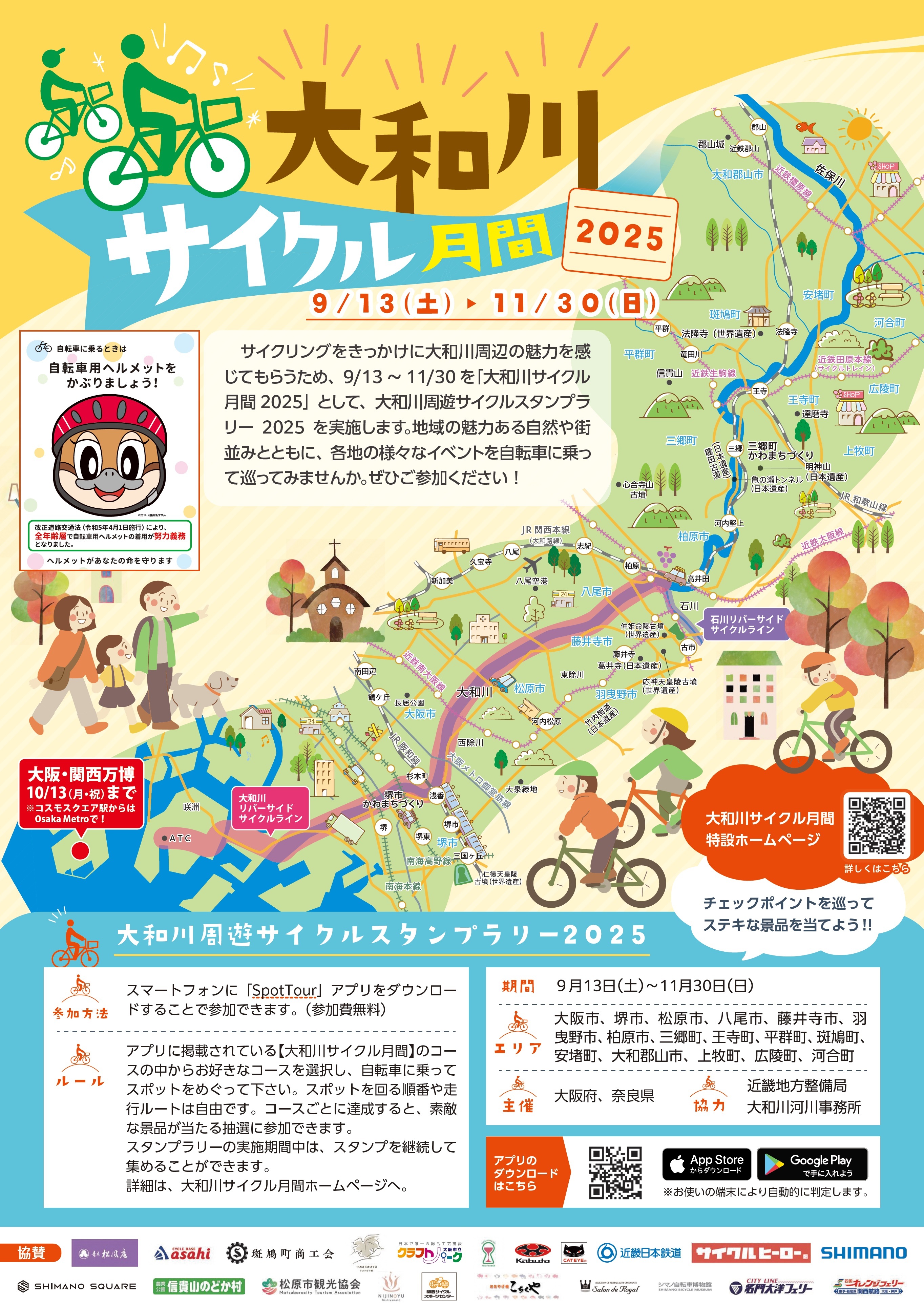 サイクリングをきっかけとして大和川周辺の魅力を感じてもらうことを目的に、9月13日(土曜)から11月30日(日曜)までの期間を「大和川サイクル月間2025」として、大和川周遊サイクルスタンプラリー2025や各地で魅力的なイベントを開催します。